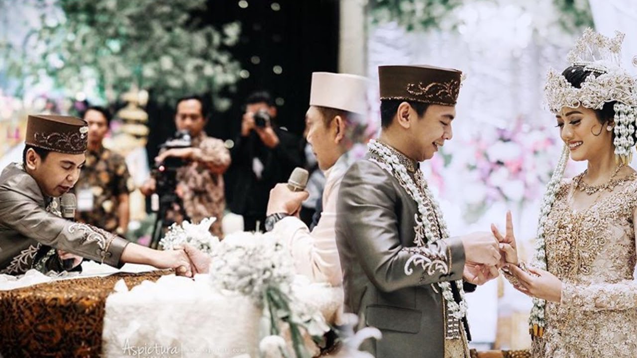 Dalam prosesi akad nikah, kedua pasangan ini kompak mengenakan busana dari adat sunda.