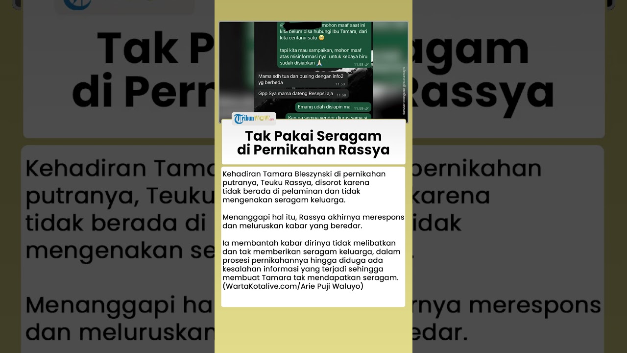 "Ini yang bener. Mohon maaf saat ini kita belum bisa hubungi Ibu Tamara, dari kita centang satu. Tapi kita mau sampaikan, mohon maaf atas misinformasi nya, untuk kebaya biru sudah disiapkan," tulis isi percakapan Teuku Rassya dengan Tamara Blezynsky, dikutip Wartakotalive.com, Selasa (14/4/2026).