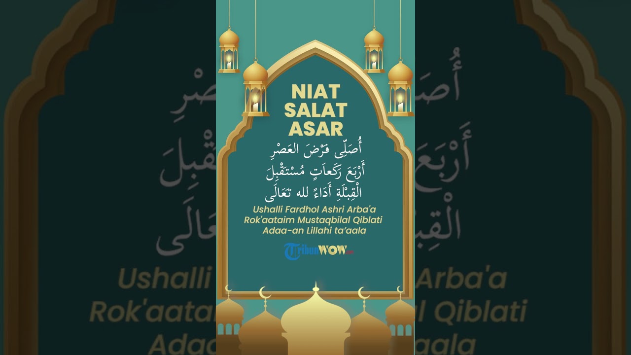 Berikut Bacaan Niat Salat 5 Waktu Lengkap dengan Tata Cara SalatNiat Salat AsarَUshalli fardhol ashri arba’a rakatain mustaqhbilal kiblati ada-an ma’muman/imaaman lillahi ta’alaArtinya : Aku berniat salat fardu asar empat raka’at menghadap kiblat sebagai ma’mum/imam karena Allah Ta’ala. (*)Artikel ini telah tayang di Tribunsumsel.com dengan judul Niat salat 5 Waktu (Isya, Subuh, Zuhur, Ashar, magrib) Lengkap dengan Tata Cara dan Bacaan salat
