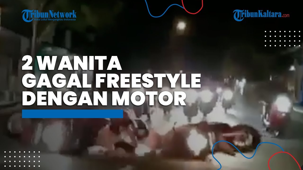 Dalam rekaman berdurasi delapan detik tersebut, terlihat dua pengemudi motor wanita yang berusaha melakukan freestyle yang gagal malah justru cium aspal.