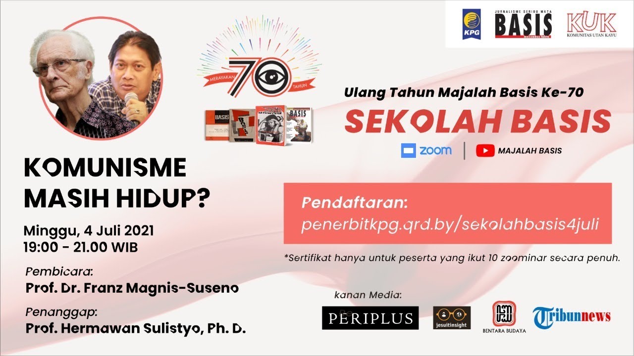 Untuk berbagi bahagia, Majalah Basis bekerjasama dengan Komunitas Utan Kayu (KUK), Kepustakaan Populer Gramedia (KPG), TribunNews, Periplus, Bentara Budaya dan Jesuit Insight menawarkan 10 zoominar SEKOLAH BASIS guna “menembus fakta”, menyentuh kedalaman etika, politik, seni, pandemi, ekonomi, filsafat dan teologi.
