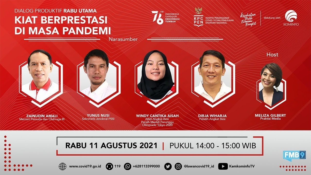 Dialog Produktif Rabu Utama di Media Center KPCPEN ini akan membahas tentang situasi dan kondisi dunia olahraga saat pandemi, bagaimana para atlet tetap bisa bugar dan berprestasi di tengah pandemi serta apa yang harus dilakukan masyarakat agar tetap bugar dan sehat. Dialog ini akan ditayangkan pada: