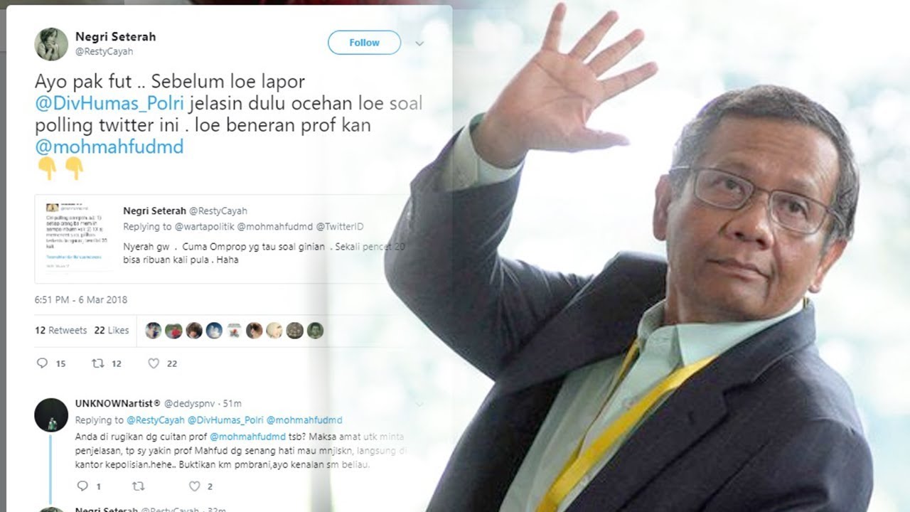 "Ayo pak fut .. Sebelum loe lapor @DivHumas_Polri jelasin dulu ocehan loe soal polling twitter ini . loe beneran prof kan @mohmahfudmd," tulis Negri Seterah.