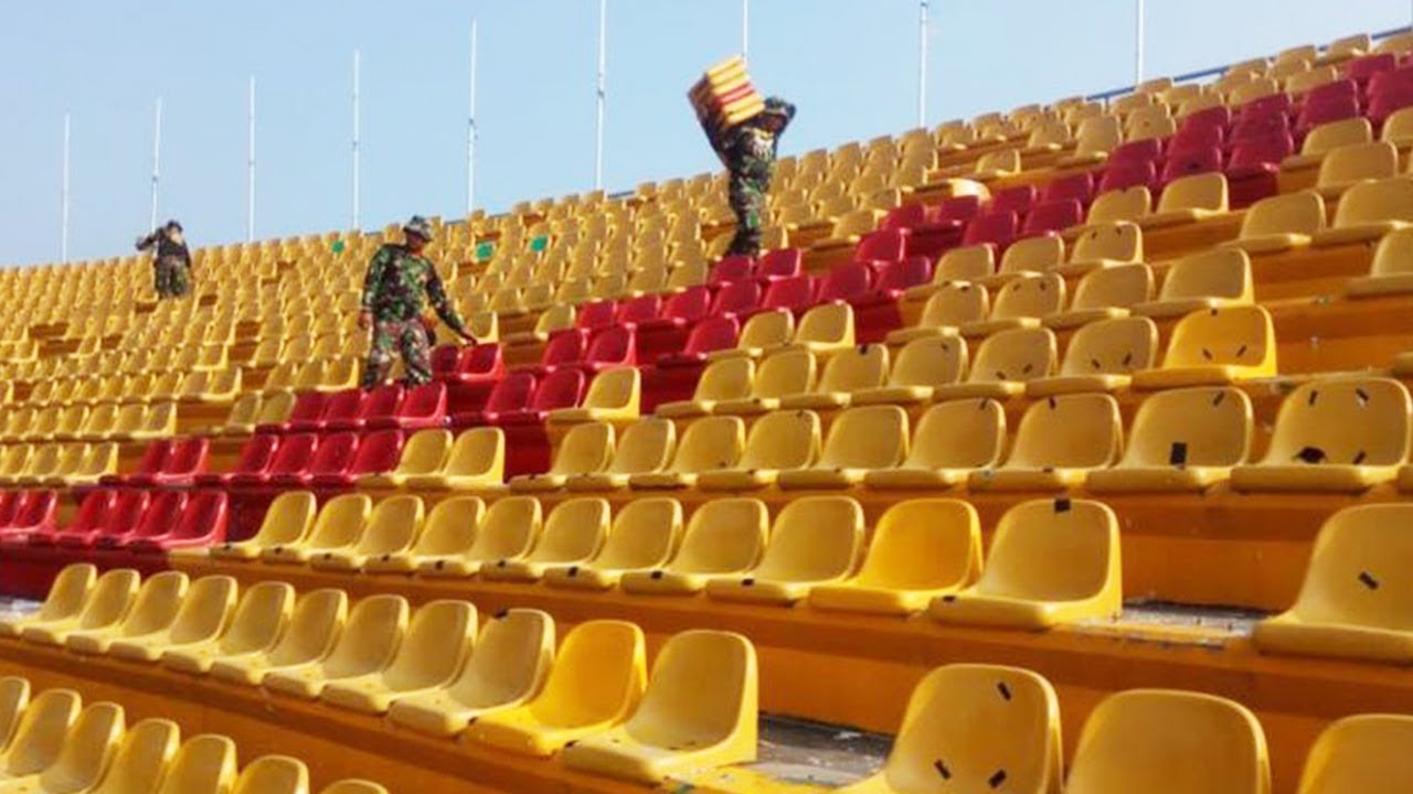 Jajaran dari Batalyon Zikon Kodam II Sriwijaya ikut memperbaiki ratusan kursi yang rusak di stadion Glora Jakabaring, Palembang, Sumatera Selatan, Senin (23/7/2018).