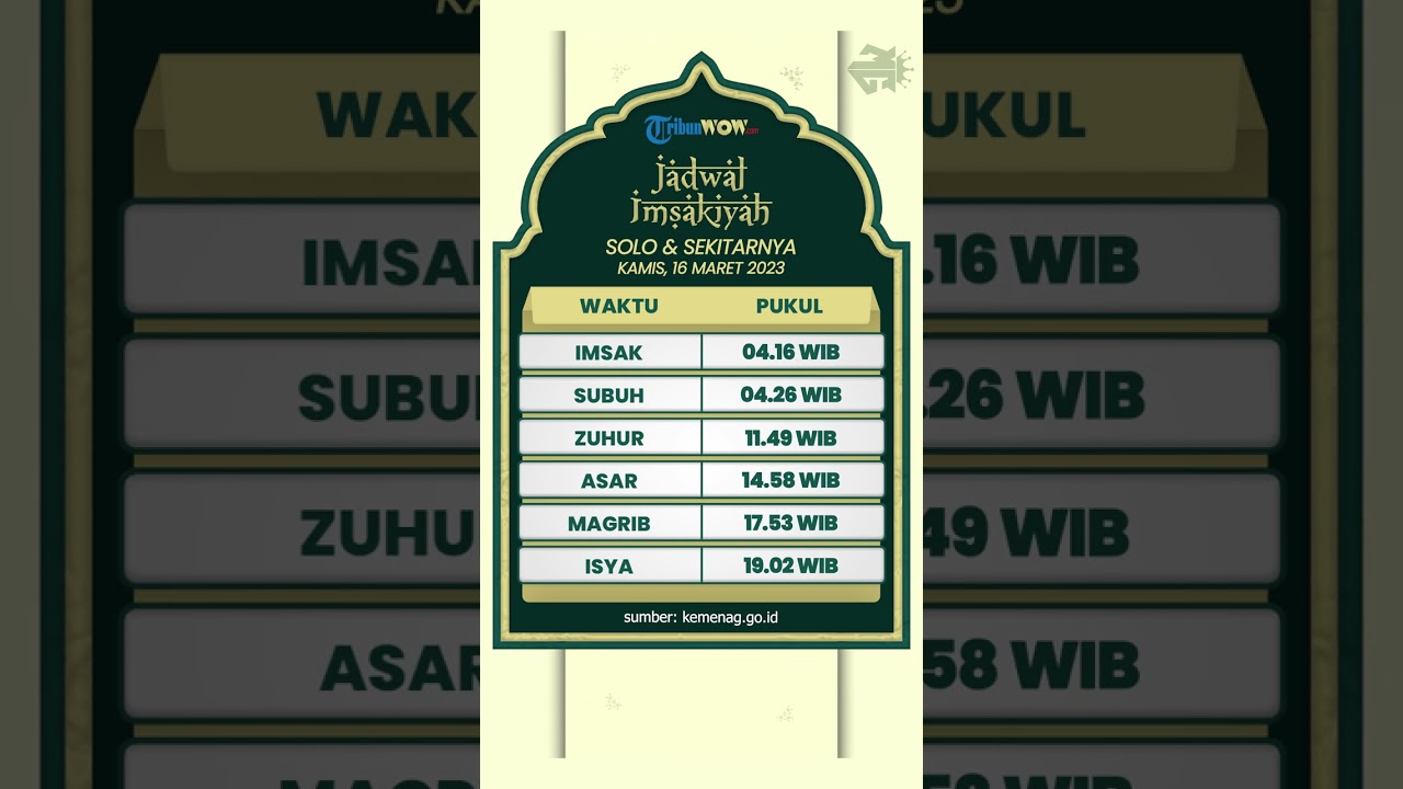 TRIBUN-VIDEO.COM - Simak jadwal imsakiyyah wilayah Solo dan sekitarnya untuk Rabu (15/3/2023), bagi Anda yang ingin melakukan ibadah puasa besok.