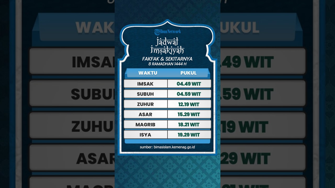 Dilansir Tribun-Video.com dari Bimasislam.kemenag, berikut ini rincian jadwal imsakiyah dan salat lima waktu di Kota Fakfak dan sekitarnya: