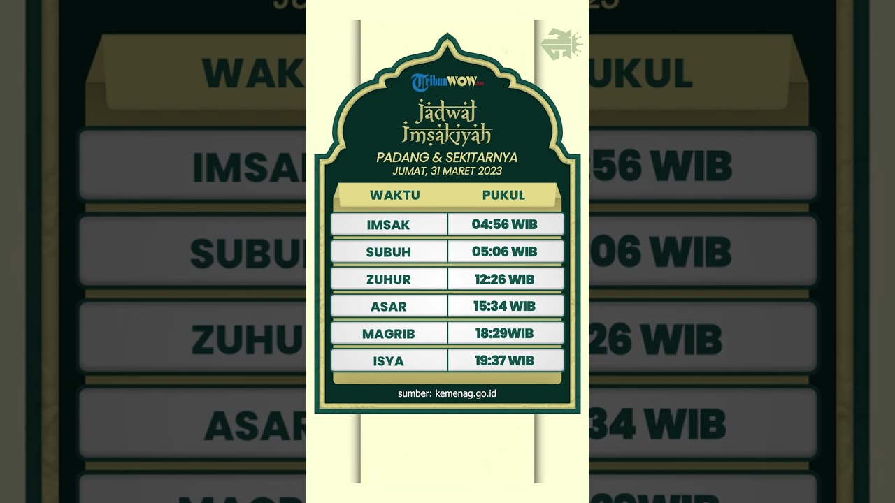 TRIBUN-VIDEO.COM - Simak jadwal imsakiyyah wilayah Padang dan sekitarnya untuk Jumat (31/3/2023), bagi Anda yang ingin melakukan ibadah puasa besok.