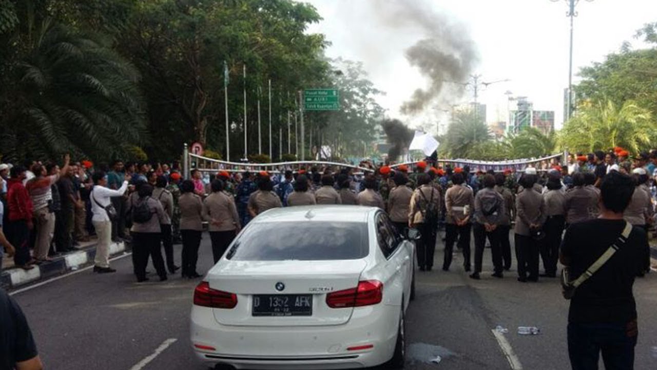 Dilansir Tribun Video dari Tribunnews, aksi tersebut dilakukan oleh ratusan orang yang membawa spanduk dan lakukan pencegatan di depan gerbang keluar Bandara SSK II Pekanbaru.