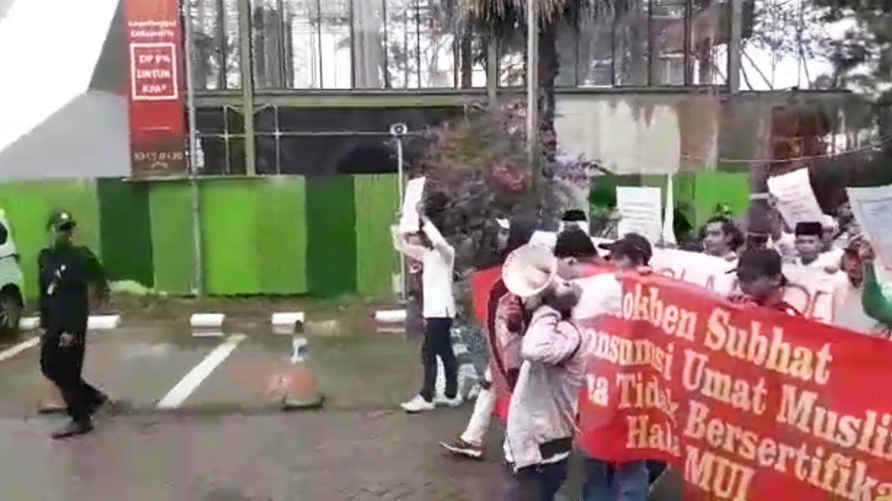 Mereka membawa spanduk berisi aspirasi yang mempertanyakan kehalalan produk HokBen.