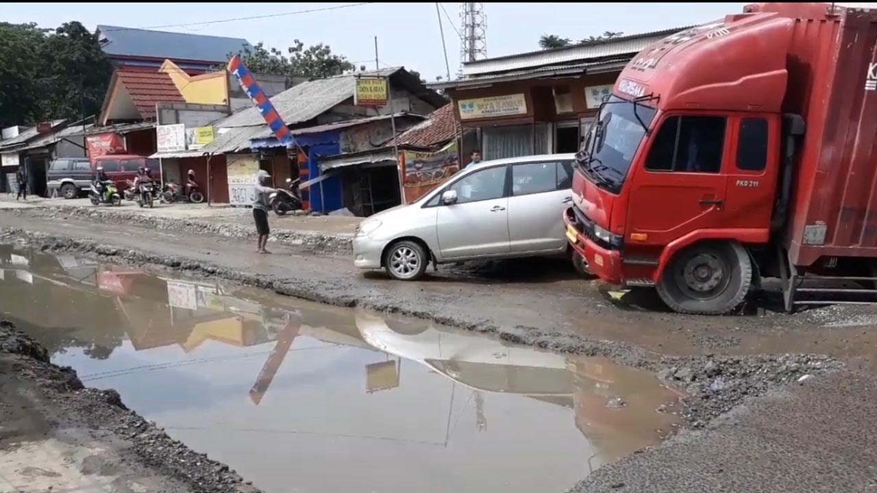 Kondisi Kerusakan Jalan Raya Legok Satu Lajur Terendam Air seperti Kolam