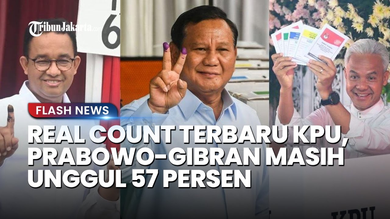 TRIBUN-VIDEO.COM - Hasil penghitungan suara atau real count Pilpres 2024 sementara berdasarkan data dari Komisi Pemilihan Umum (KPU) RI pada Sabtu (17/2/2024) sekira pukul 08.00 WIB, masih dipimpin oleh pasangan Prabowo Subianto-Girban Rakabuming Raka.