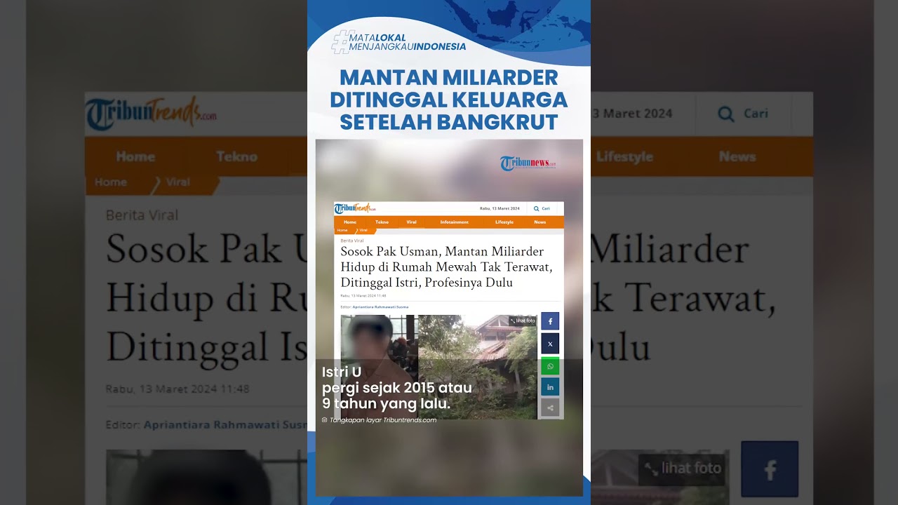 Artikel ini telah tayang di Tribuntrends.com dengan judul Sosok Pak Usman, Mantan Miliarder Hidup di Rumah Mewah Tak Terawat, Ditinggal Istri, Profesinya Dulu