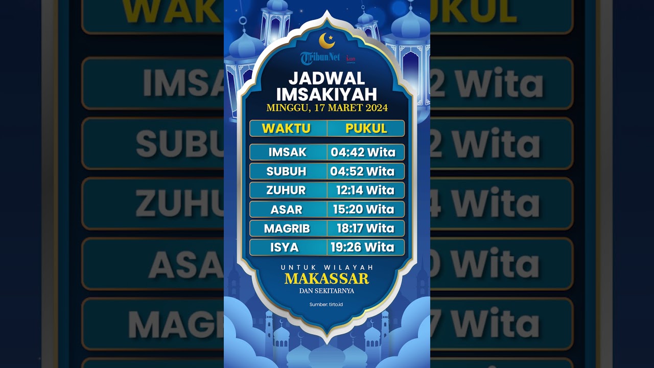 TRIBUN-VIDEO.COM - Simak jadwal imsakiyah dan buka puasa di Makassar dan sekitarnya untuk besok Minggu 17 Maret 2024 dan juga Puasa Ramadhan 1445H.