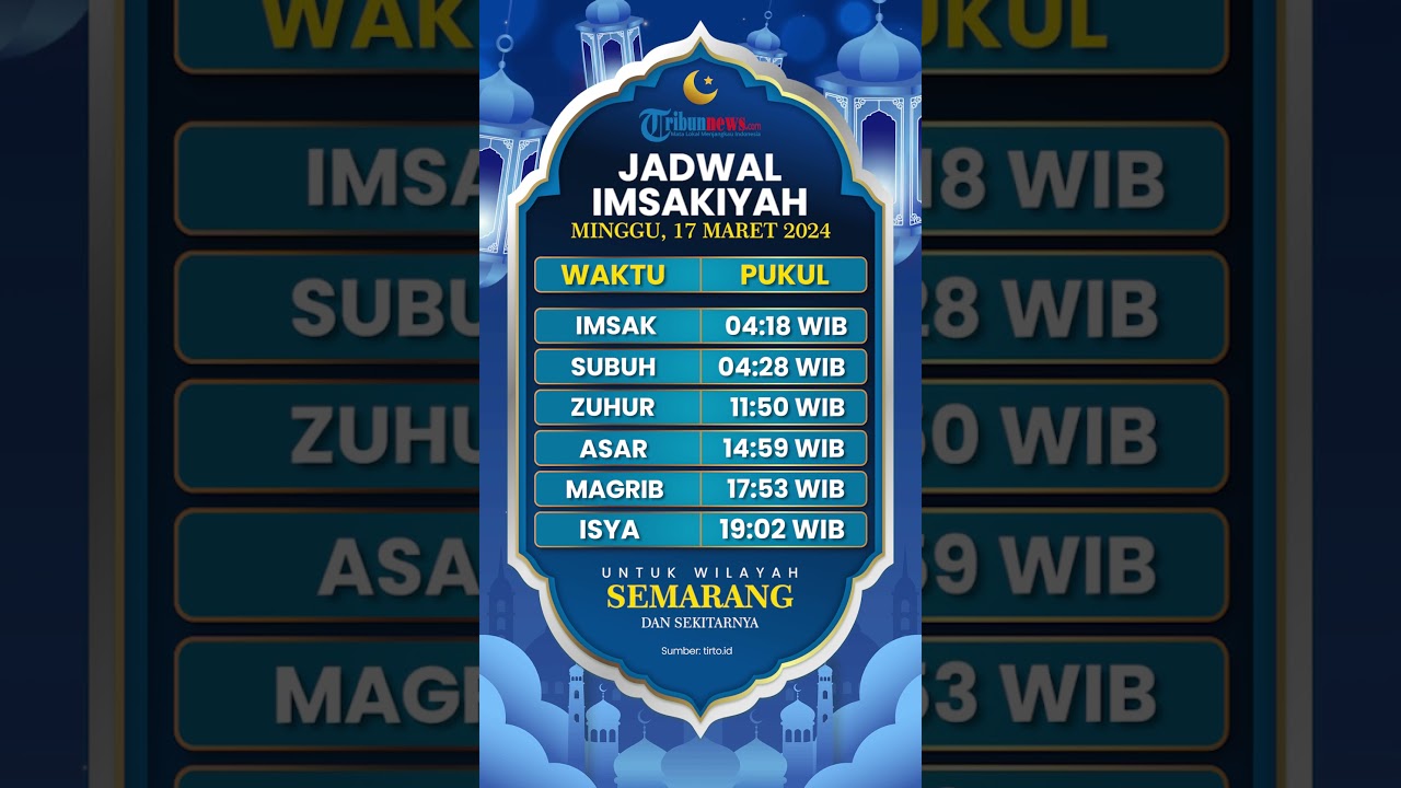 TRIBUN-VIDEO.COM - Simak jadwal imsakiyah dan buka puasa di Semarang dan sekitarnya untuk besok Minggu 17 Maret 2024 dan juga Puasa Ramadhan 1445H.