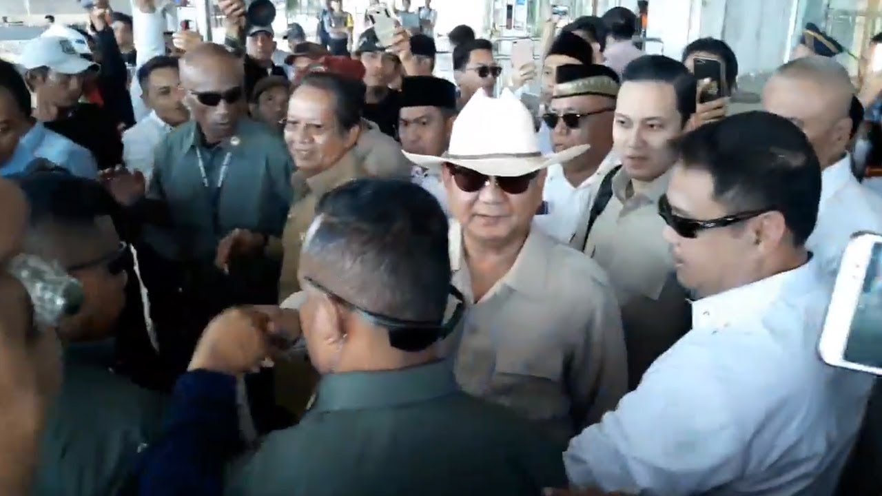Turun dari pesawat, Prabowo yang mengenakan topi Cowboy warna krem disambut Ketua Gerindra Sulawesi Tengah, Longki Djanggola, dan sejumlah pengurus serta relawan partai Gerindra.