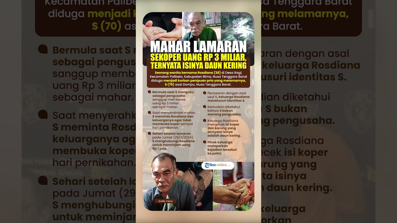 TRIBUN-VIDEO.COM - Seorang wanita bernama Rosdiana (38) di Desa Ragi, Kecamatan Palibelo, Kabupaten Bima, Nusa Tenggara Barat diduga menjadi korban penipuan pria yang melamarnya, S (70) asal Dompu, Nusa Tenggara Barat.