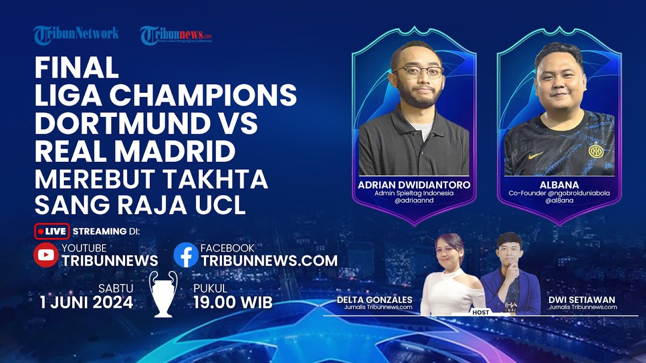 TRIBUN-VIDEO.COM - Laga final Liga Champions 2023/2024 akan mempertemukan Borussia Dortmund vs Real Madrid.