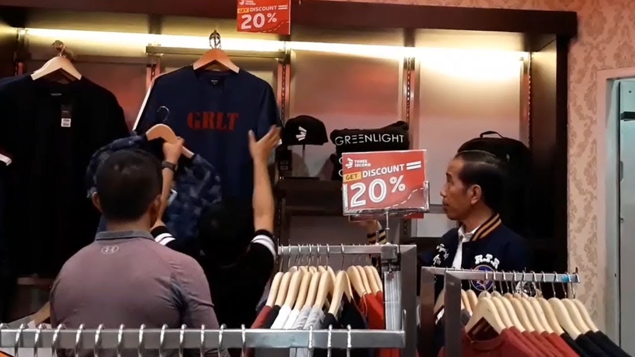 Gerai yang dimasuki yakni Greenlight dan 3second. Langsung saja Jokowi menuju ke deretan kaos yang bertuliskan diskon 20 persen.