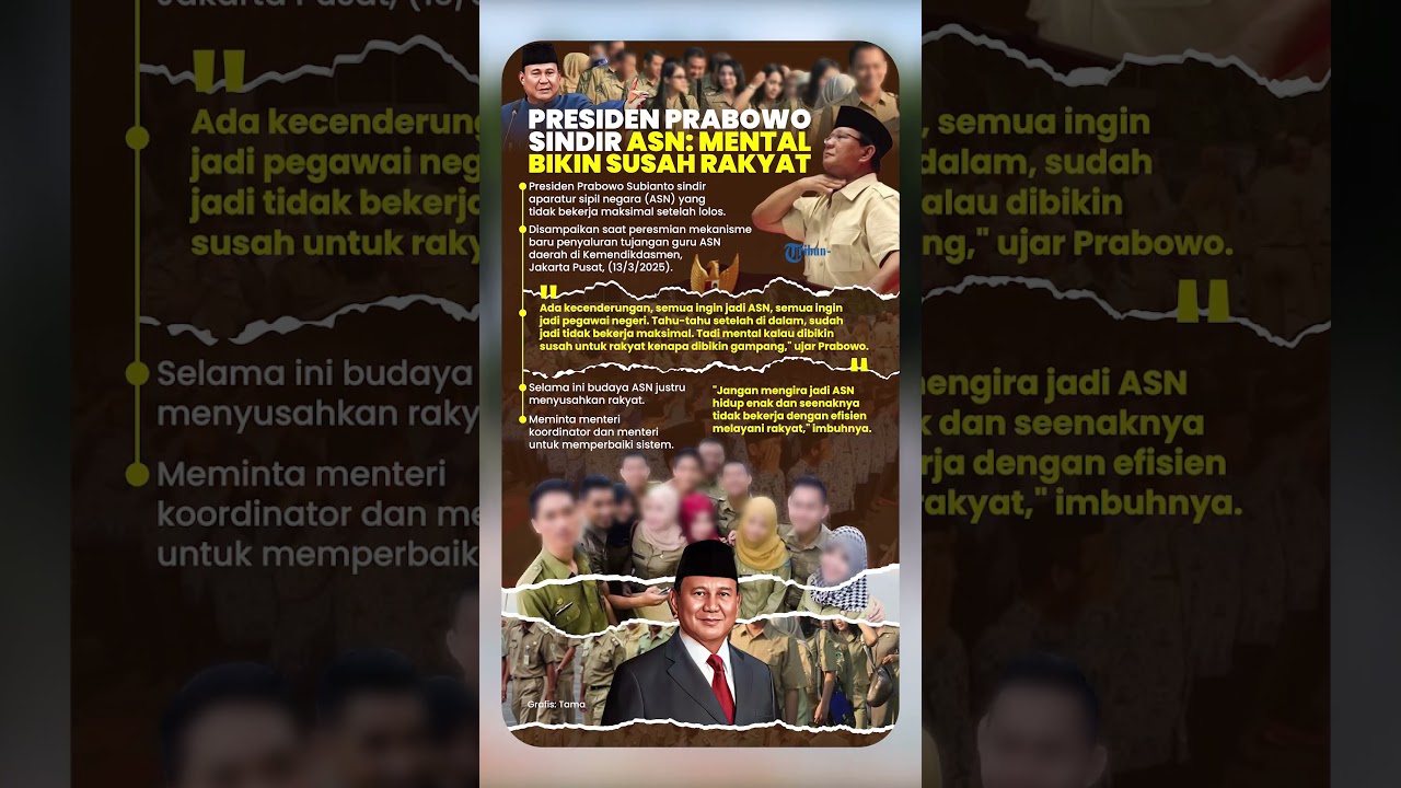 "Ada kecenderungan, semua ingin jadi ASN, semua ingin jadi pegawai negeri. Tahu-tahu setelah di dalam, sudah jadi tidak bekerja maksimal. Tadi mental kalau dibikin susah untuk rakyat kenapa dibikin gampang," ujar Prabowo.