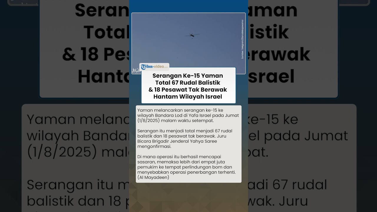 TRIBUN-VIDEO.COM - Yaman kembali melancarkan serangan ke-15 ke wilayah Bandara Lod di Yafa Israel pada Jumat (1/8/2025) malam waktu setempat.