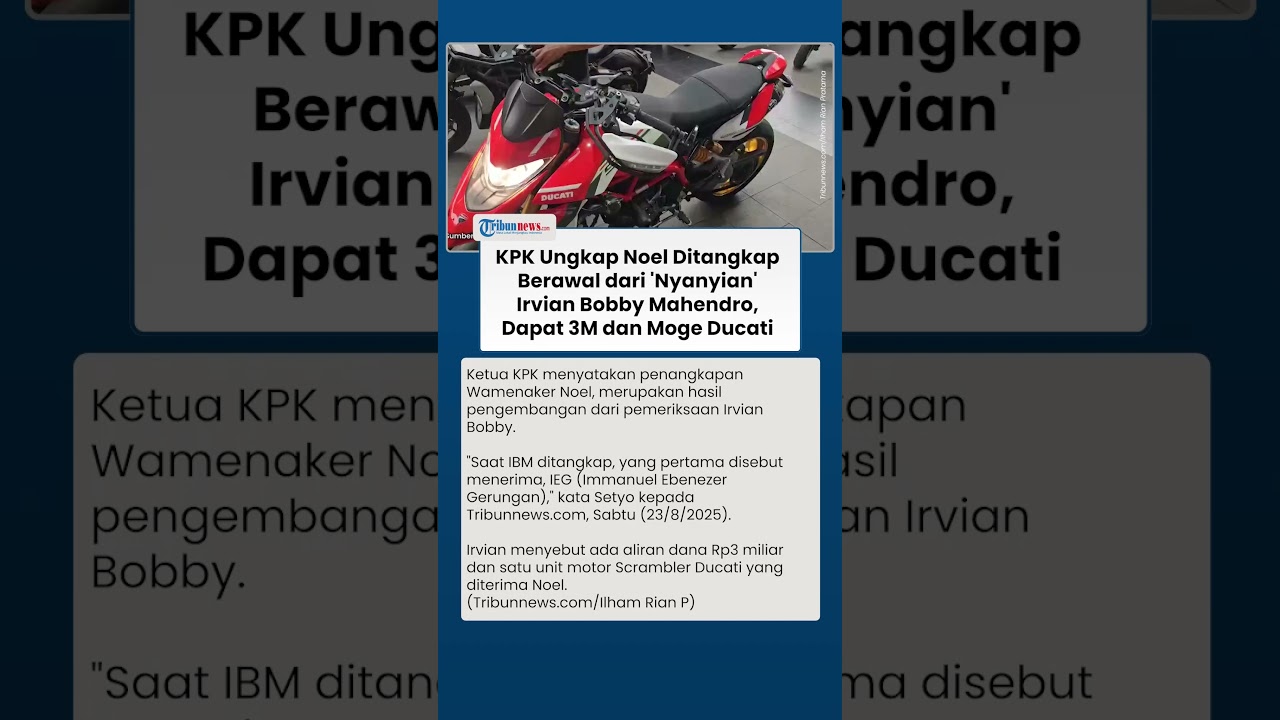 Menurut Setyo, Irvian menyebut ada aliran dana Rp3 miliar dan satu unit motor Scrambler Ducati yang diterima Noel.