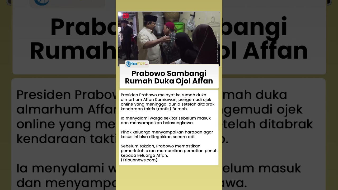 TRIBUN-VIDEO.COM - Presiden RI Prabowo Subianto melayat ke rumah duka almarhum Affan Kurniawan, pengemudi ojek online yang meninggal dunia setelah ditabrak kendaraan taktis (rantis) Brimob pada aksi demonstrasi ricuh.