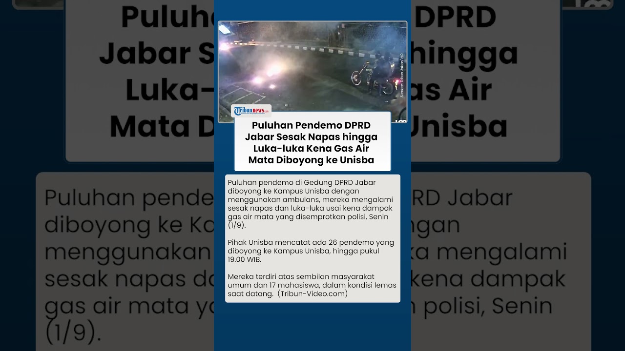 TRIBUN-VIDEO.COM - Puluhan pendemo di Gedung DPRD Jabar diboyong ke Kampus Unisba dengan menggunakan ambulans, mereka mengalami sesak napas dan luka-luka usai kena dampak gas air mata yang disemprotkan polisi, Senin (1/9).