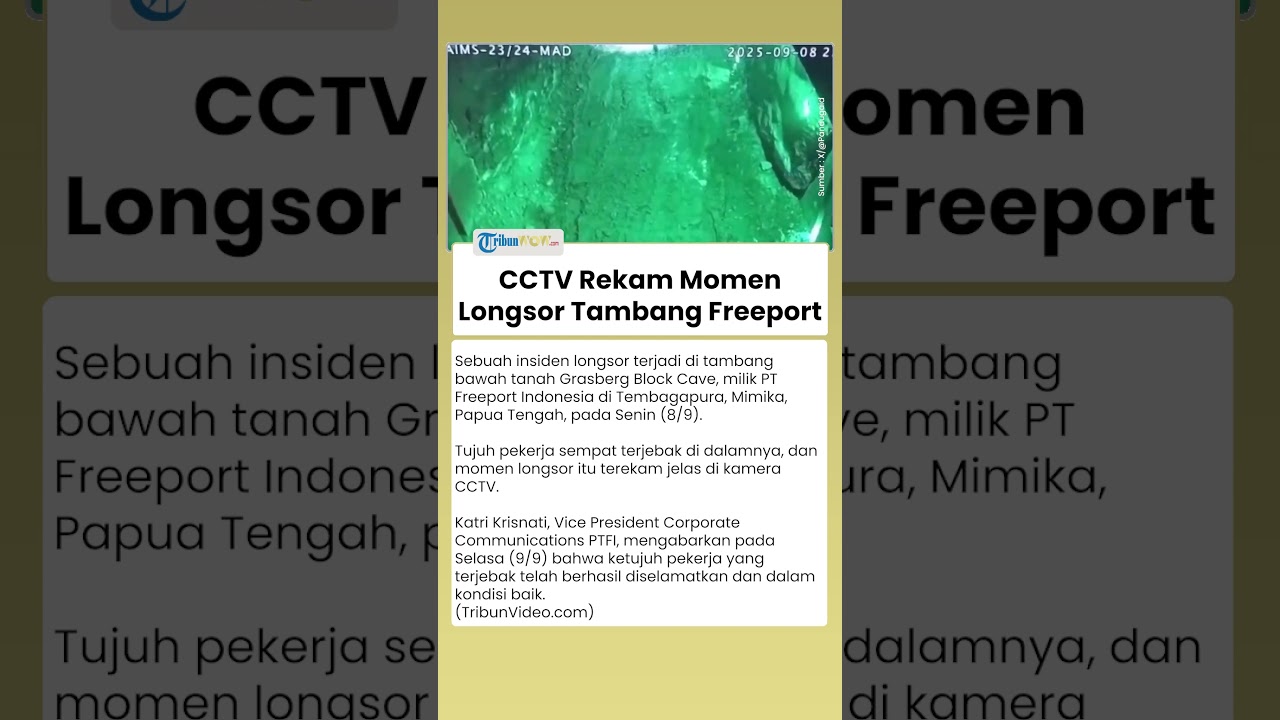 TRIBUN-VIDEO.COM - Sebuah insiden longsor terjadi di tambang bawah tanah Grasberg Block Cave, milik PT Freeport Indonesia di Tembagapura, Mimika, Papua Tengah, pada Senin (8/9). Tujuh pekerja sempat terjebak di dalamnya, dan momen longsor itu terekam jelas di kamera CCTV.