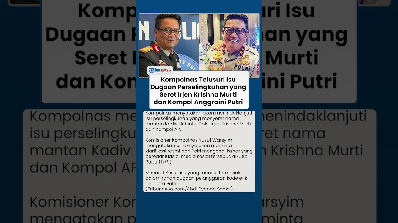 TRIBUN-VIDEO.COM - Komisi Kepolisian Nasional (Kompolnas) menyatakan akan menindaklanjuti isu dugaan perselingkuhan yang menyeret nama mantan Kadiv Hubinter Polri, Irjen Krishna Murti.