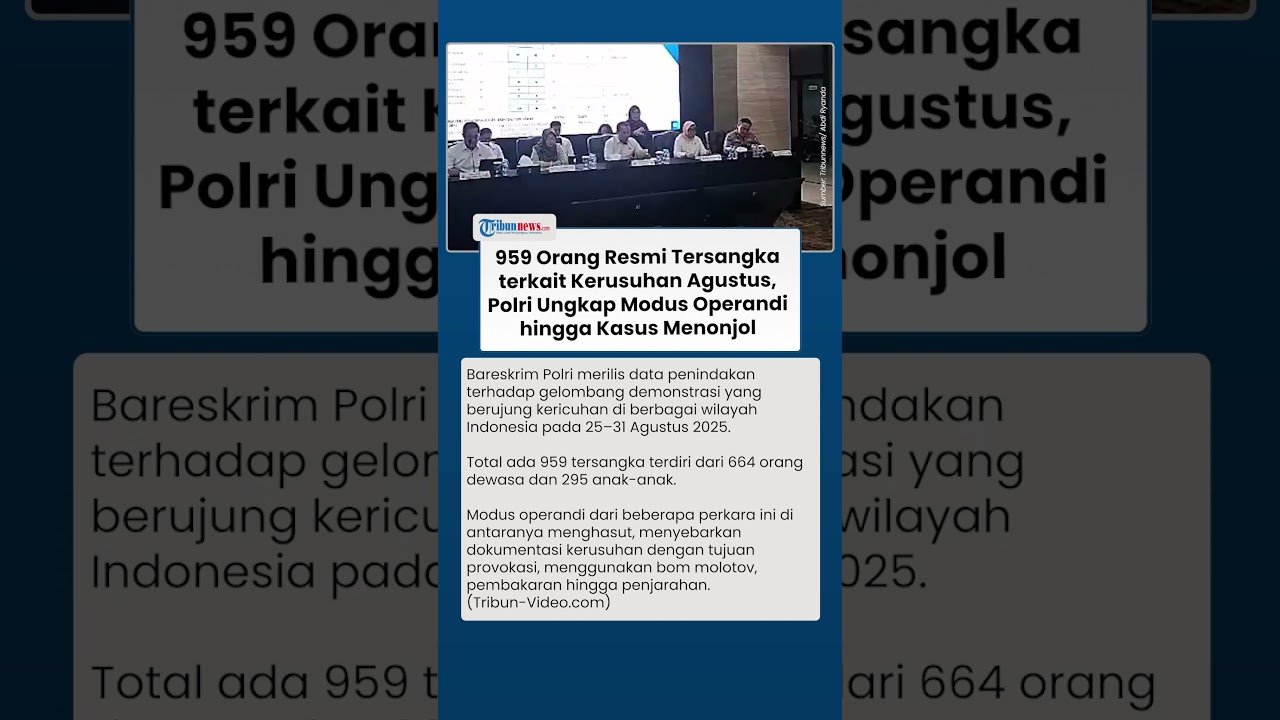 TRIBUN-VIDEO.COM - Bareskrim Polri merilis data penindakan terhadap gelombang demonstrasi yang berujung kericuhan di berbagai wilayah Indonesia pada 25–31 Agustus 2025.