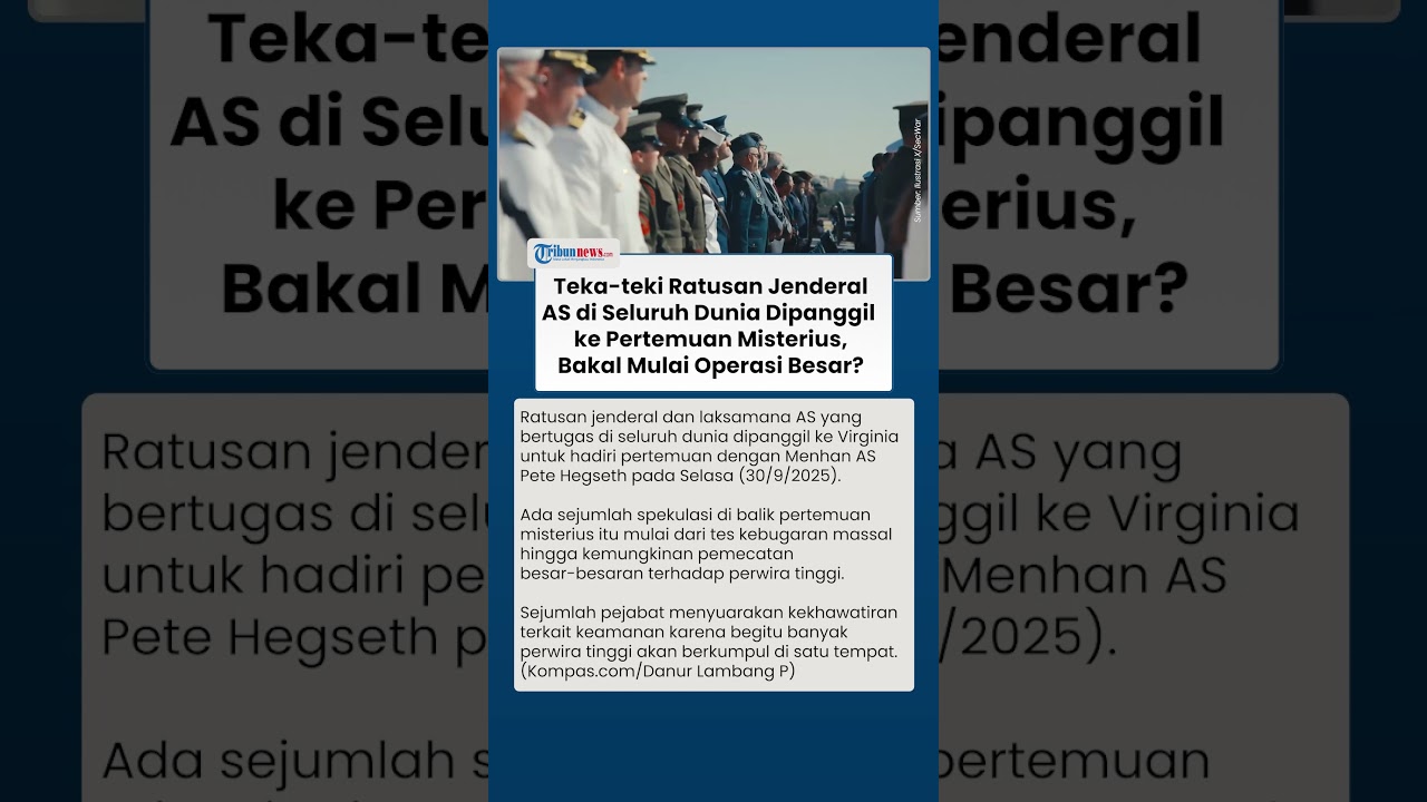 TRIBUN-VIDEO.COM - Ratusan jenderal dan laksamana AS yang bertugas di seluruh dunia dipanggil ke Virginia untuk menghadiri pertemuan dengan Menteri Pertahanan (Menhan) AS Pete Hegseth pada Selasa (30/9/2025) mendatang.