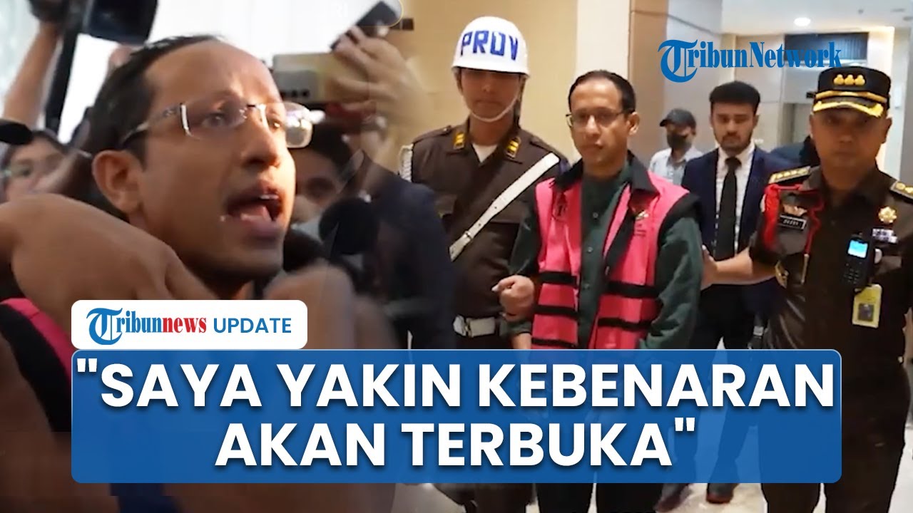 Nadiem yang saat itu mengenakan rompi tahanan kejaksaan dengan tangan diborgol dan dikawal sejumlah petugas menuju mobil tahanan.
