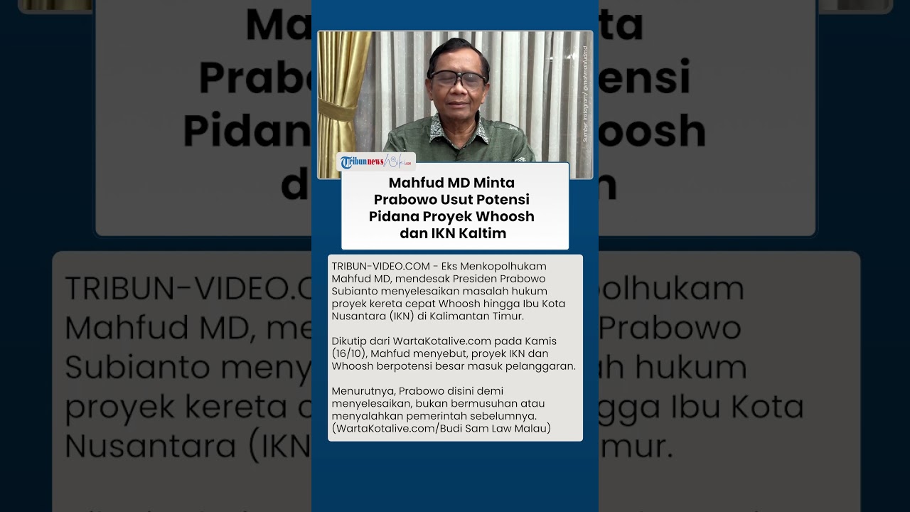 TRIBUN-VIDEO.COM-- Selain menduga adanya pelanggaran pidana berupa korupsi dalam proyek kereta cepat Whoosh, mantan Menko Polhukam Mahfud MD juga menyatakan hal senada terjadi pada proyek Ibu Kota Nusantara (IKN) di Kalimantan Timur.