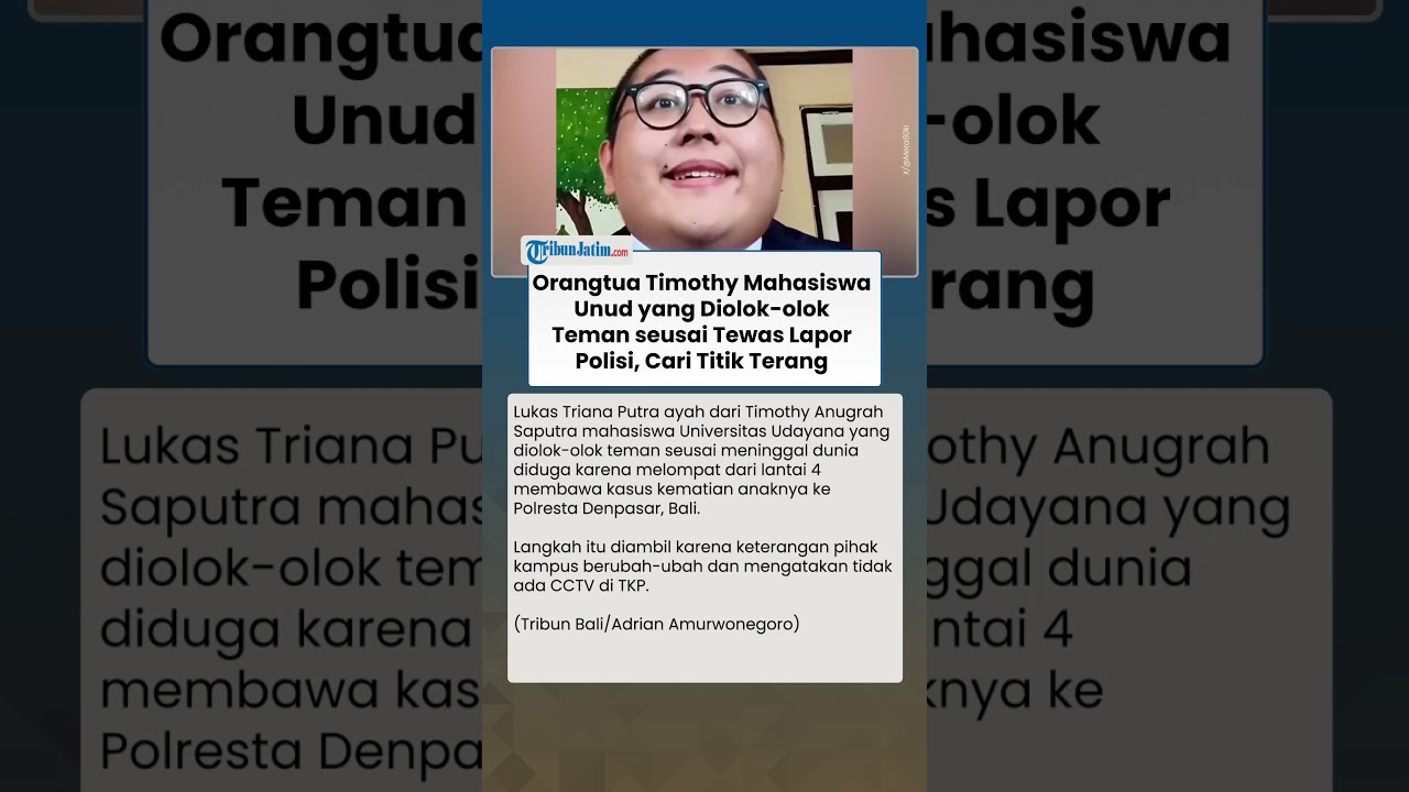 TRIBUN-VIDEO.COM - Lukas Triana Putra ayah dari Timothy Anugrah Saputra mahasiswa Universitas Udayana yang diolok-olok teman seusai meninggal dunia diduga karena melompat dari lantai 4 membawa kasus kematian anaknya ke Polresta Denpasar, Bali.
