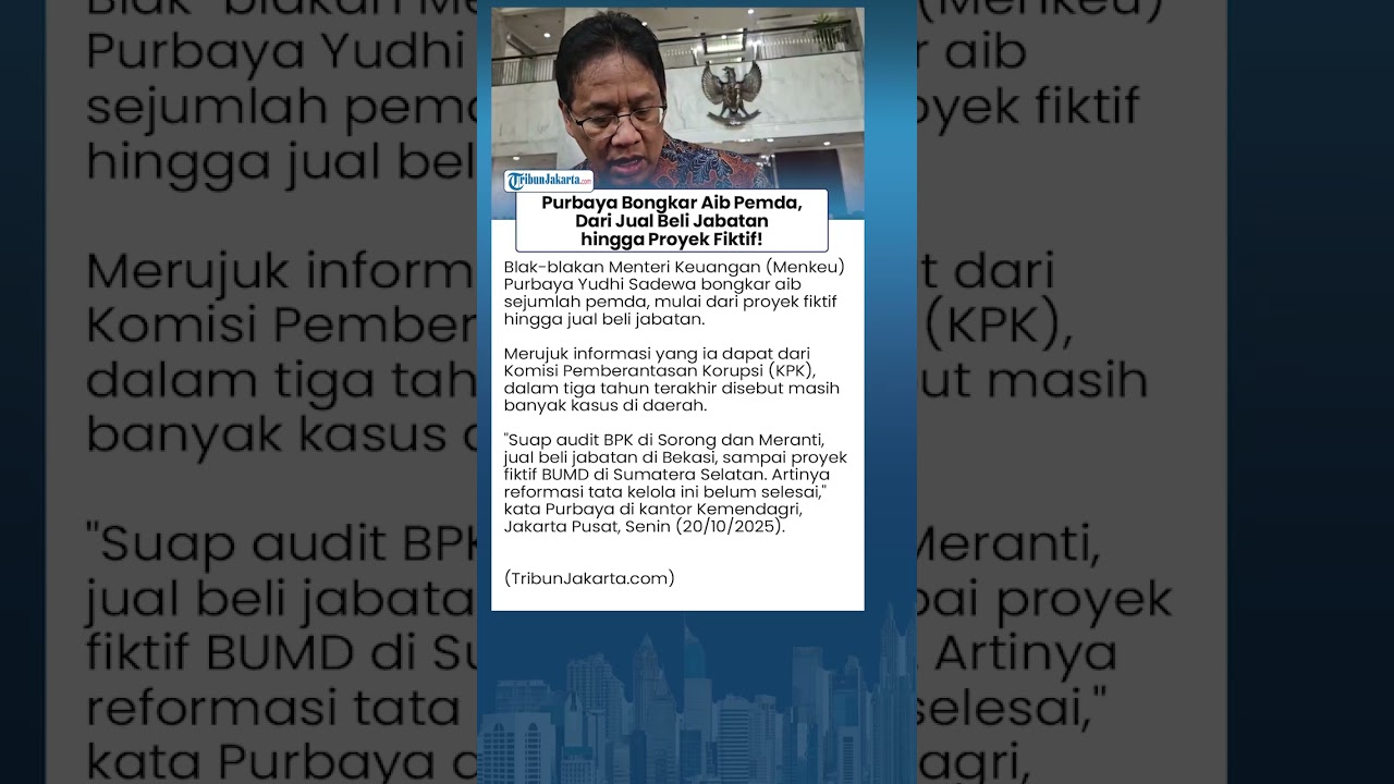 "Suap audit BPK di Sorong dan Meranti, jual beli jabatan di Bekasi, sampai proyek fiktif BUMD di Sumatera Selatan. Artinya reformasi tata kelola ini belum selesai," kata Purbaya di kantor Kemendagri, Jakarta Pusat, Senin (20/10/2025).