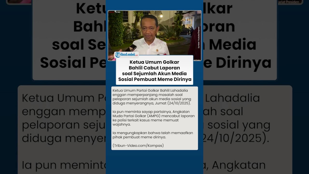 TRIBUN-VIDEO.COM - Ketua Umum Partai Golkar Bahlil Lahadalia enggan memperpanjang masalah soal pelaporan sejumlah akun media sosial yang diduga menyerangnya, Jumat (24/10/2025).