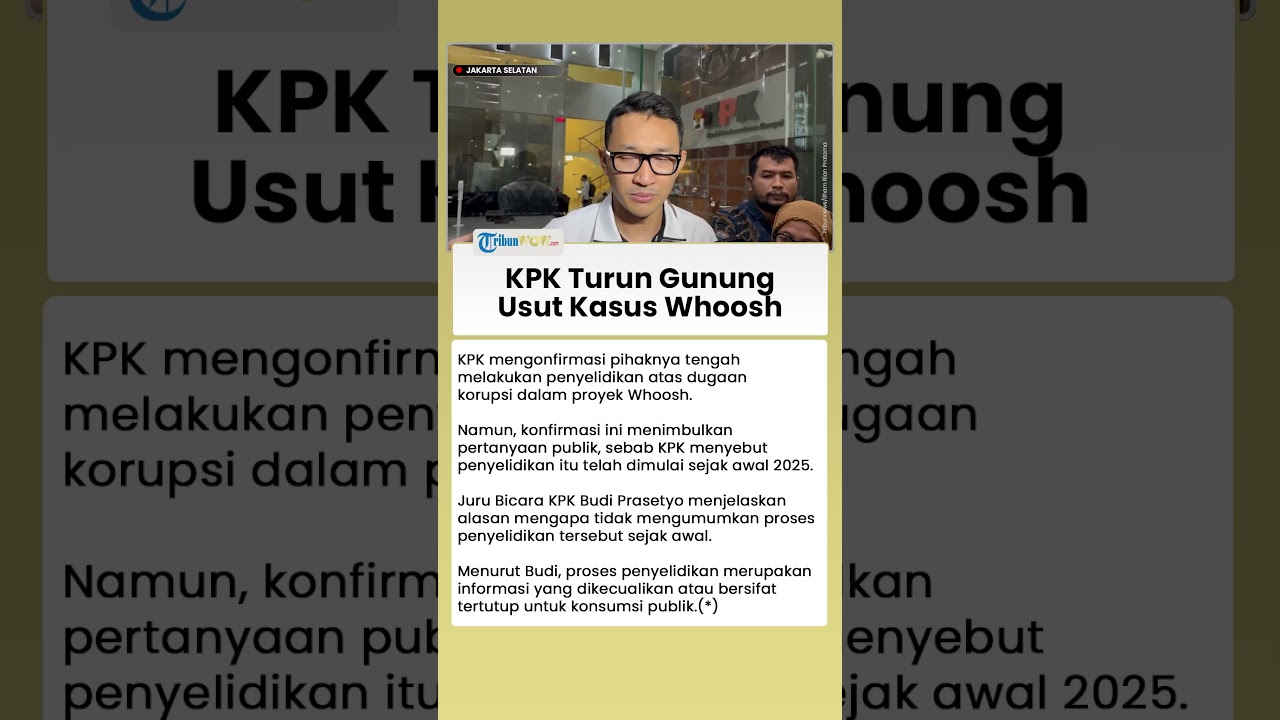 TRIBUN-VIDEO.COM - Komisi Pemberantasan Korupsi (KPK) mengonfirmasi pihaknya tengah melakukan penyelidikan atas dugaan korupsi dalam proyek Kereta Cepat Jakarta-Bandung atau Whoosh.