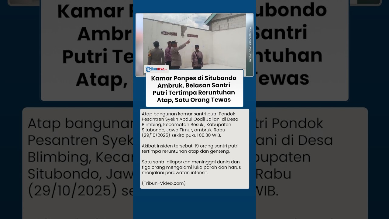 TRIBUN-VIDEO.COM - Atap bangunan kamar santri putri Pondok Pesantren Syekh Abdul Qodil Jailani di Desa Blimbing, Kecamatan Besuki, Kabupaten Situbondo, Jawa Timur, ambruk, Rabu (29/10/2025) sekira pukul 00.30 WIB.