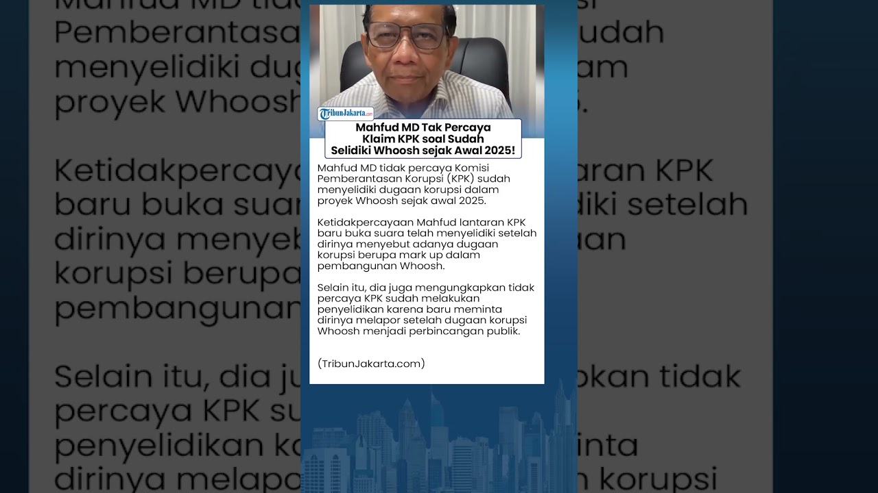 TRIBUN-VIDEO.COM - Mantan Menteri Koordinator Bidang Politik, Hukum, dan Keamanan (Menkopolhukam) Mahfud MD tidak percaya Komisi Pemberantasan Korupsi (KPK) sudah menyelidiki dugaan korupsi dalam proyek Kereta Cepat Jakarta Bandung (KCJB) alias Whoosh sejak awal 2025.