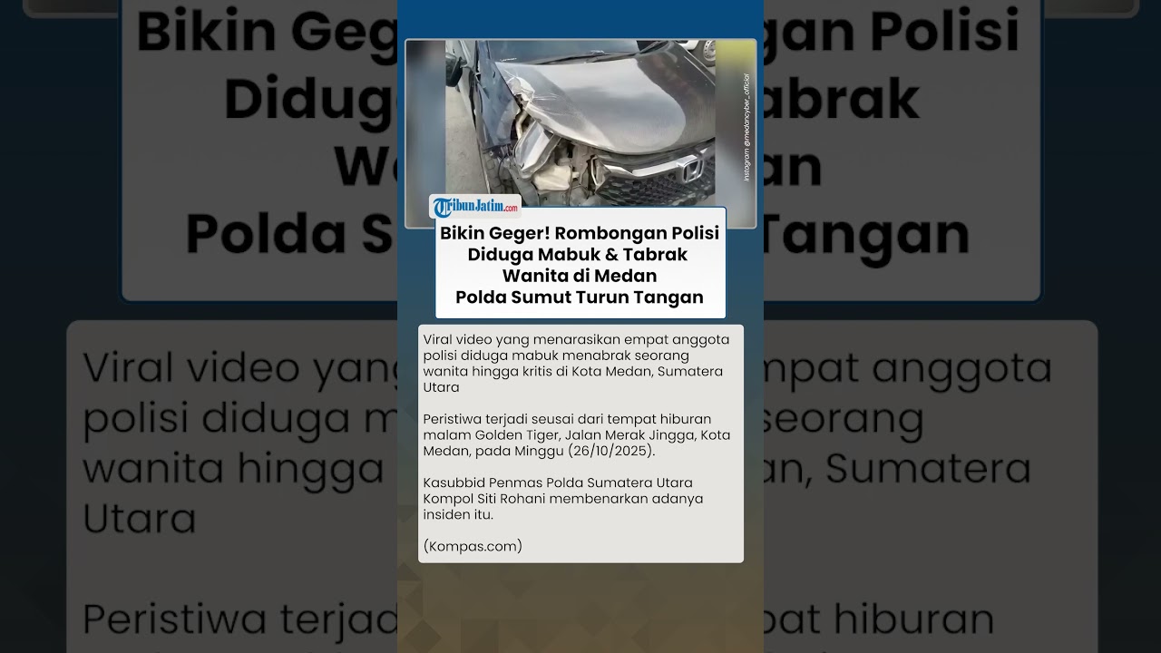 TRIBUN-VIDEO.COM - Viral video yang menarasikan empat anggota polisi diduga mabuk menabrak seorang wanita hingga kritis di Kota Medan, Sumatera Utara