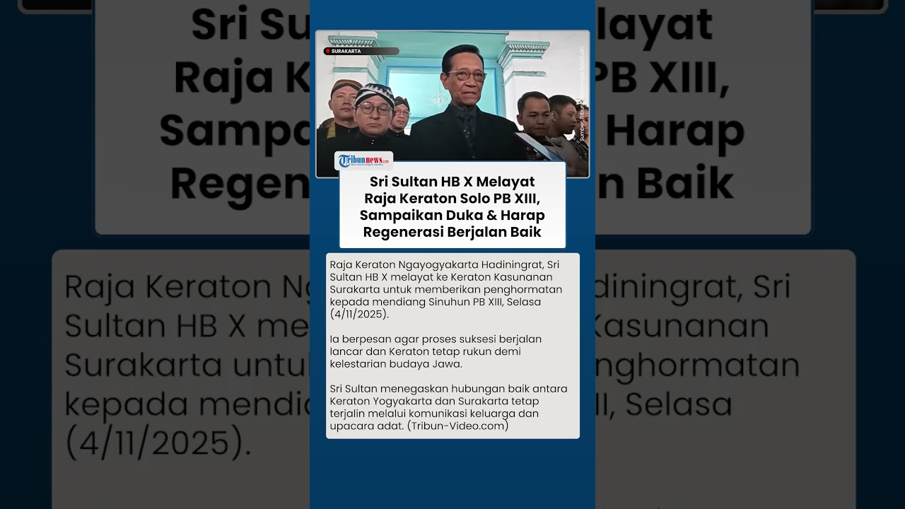TRIBUN-VIDEO.COM - Raja Keraton Ngayogyakarta Hadiningrat, Sri Sultan Hamengkubuwono X melayat ke Keraton Kasunanan Surakarta untuk memberikan penghormatan kepada mendiang Sinuhun Pakubuwono XIII, Selasa (4/11/2025).