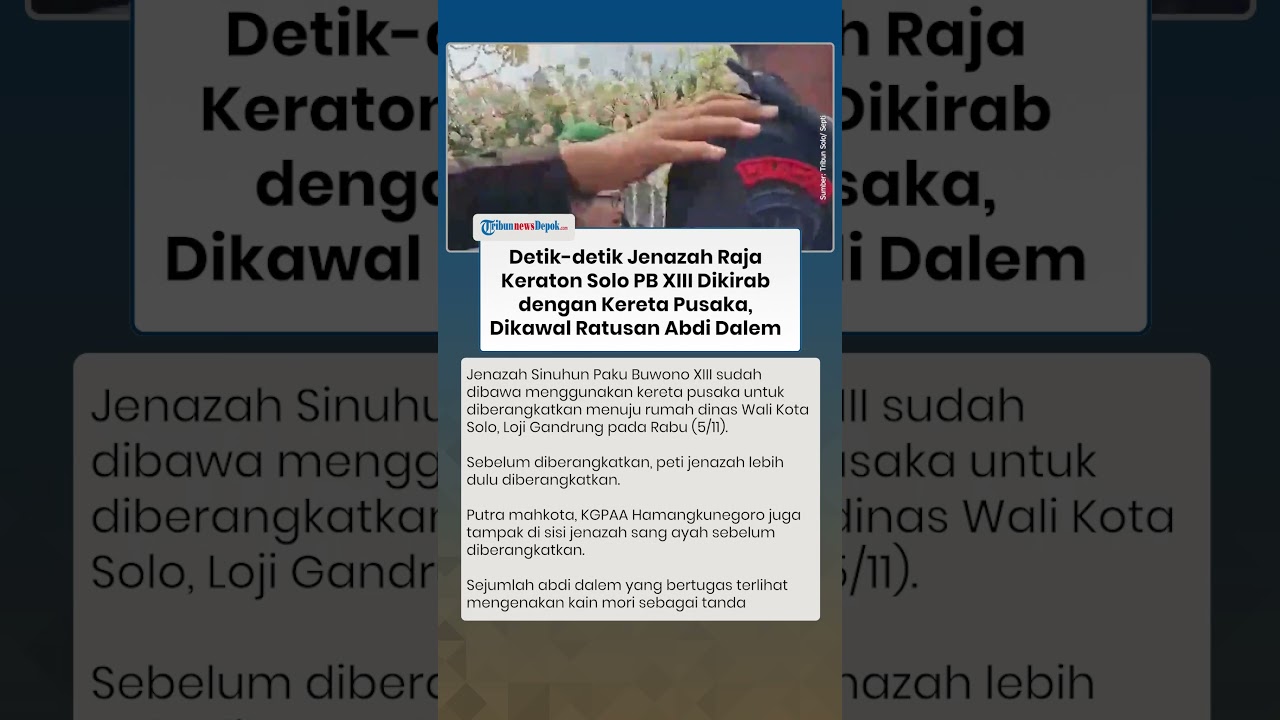 TRIBUN-VIDEO.COM - Jenazah Sri Susuhunan Paku Buwono XIII telah diberangkatkan dari Keraton Surakarta Hadiningrat menuju rumah dinas Wali Kota Solo, Loji Gandrung pada Rabu (5/11).