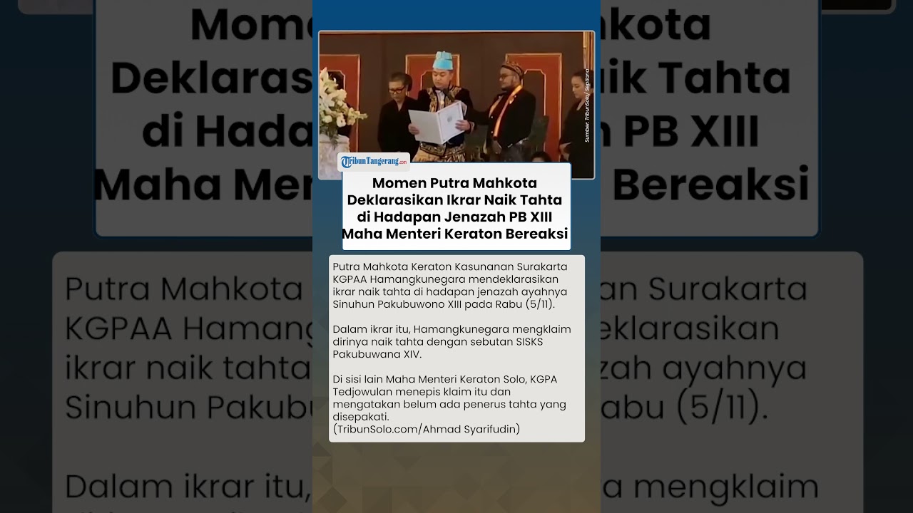 TRIBUN-VIDEO.COM - Putra Mahkota Keraton Kasunanan Surakarta KGPAA Hamangkunegara mendeklarasikan ikrar naik tahta di hadapan jenazah ayahnya Sinuhun Pakubuwono XIII pada Rabu (5/11).