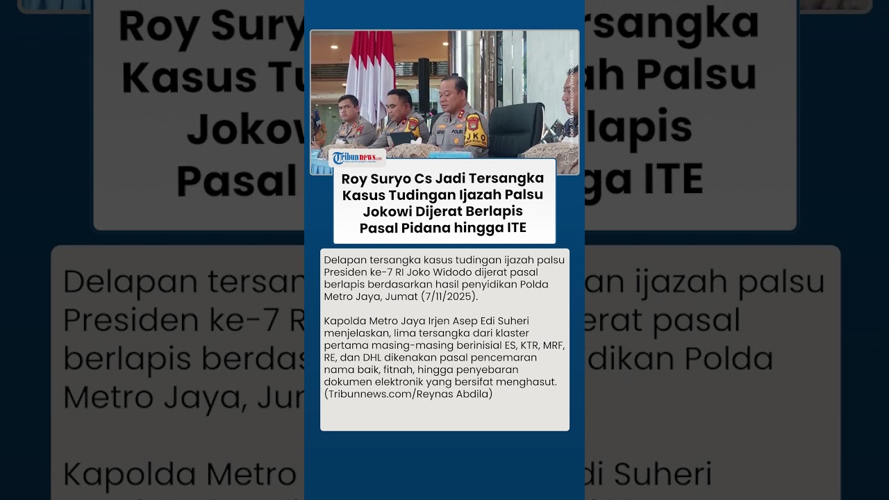 TRIBUN-VIDEO.COM - Delapan tersangka kasus tudingan ijazah palsu Presiden ke-7 RI Joko Widodo dijerat pasal berlapis berdasarkan hasil penyidikan Polda Metro Jaya, Jumat (7/11/2025).
