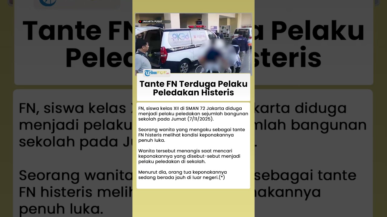 TRIBUN-VIDEO.COM - FN, siswa kelas XII di SMAN 72 Jakarta diduga menjadi pelaku peledakan sejumlah bangunan sekolah pada Jumat (7/11/2025).