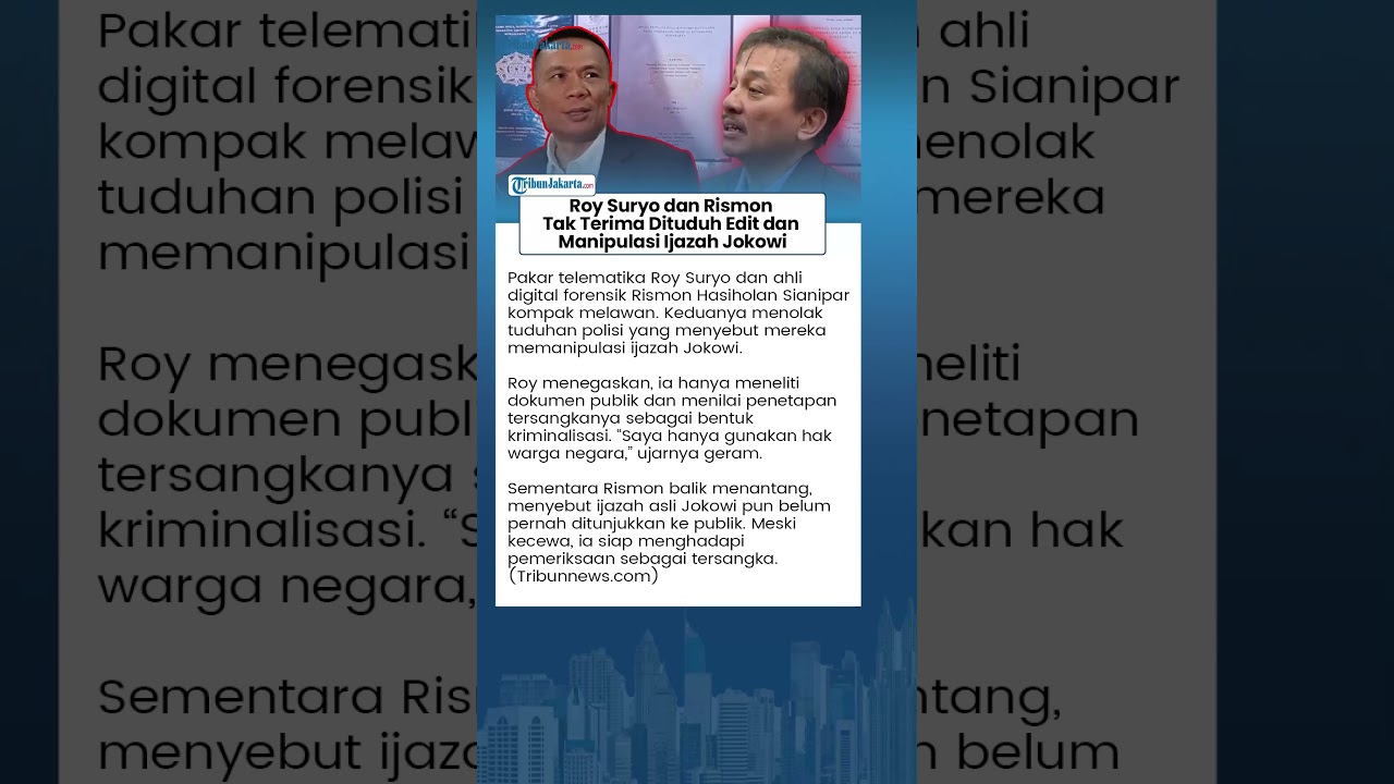 TRIBUN-VIDEO.COM - Pakar telematika Roy Suryo dan ahli digital forensik Rismon Hasiholan Sianipar kompak membantah klaim polisi yang mengatakan bahwa mereka memanipulasi ijazah Presiden ke-7 Jokowi.
