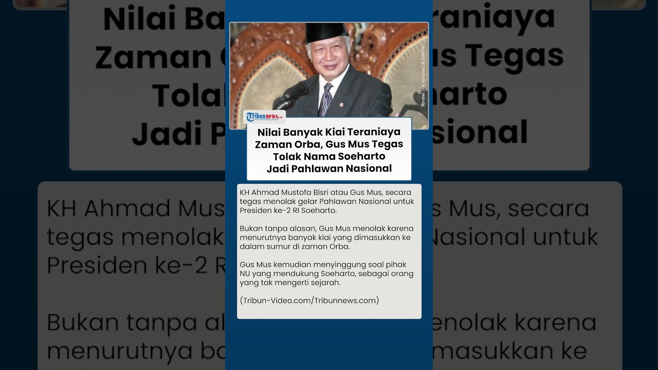 TRIBUN-VIDEO.COM - KH Ahmad Mustofa Bisri atau Gus Mus, secara tegas menolak gelar Pahlawan Nasional untuk Presiden ke-2 RI Soeharto.