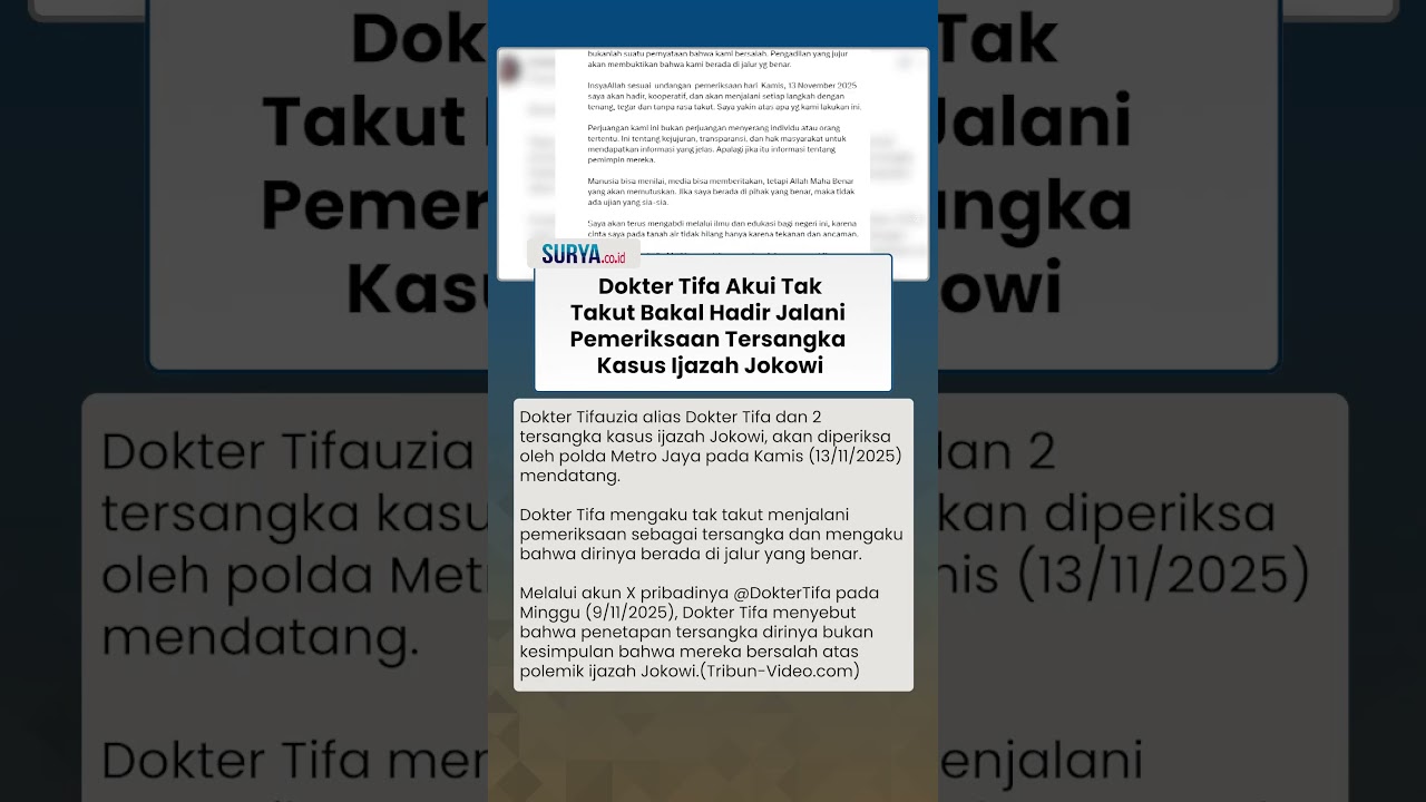 Melalui akun X pribadinya @DokterTifa pada Minggu (9/11/2025), Dokter Tifa menyebut bahwa penetapan tersangka dirinya bukan kesimpulan bahwa mereka bersalah atas polemik ijazah Jokowi.