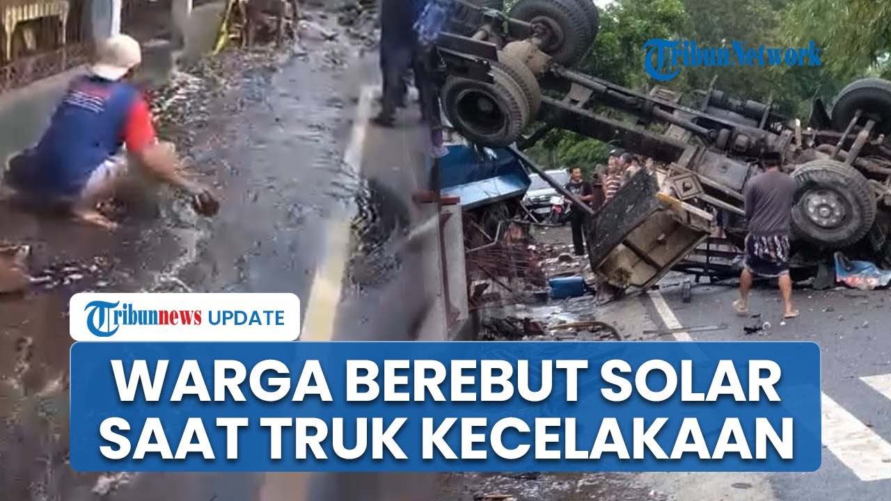 Warga setempat terlihat berebut menampung tumpahan solar yang berserakan diduga berasal dari truk yang terlibat kecelakaan pada Selasa (11/11/2025), sekira pukul 05.00 WIB.