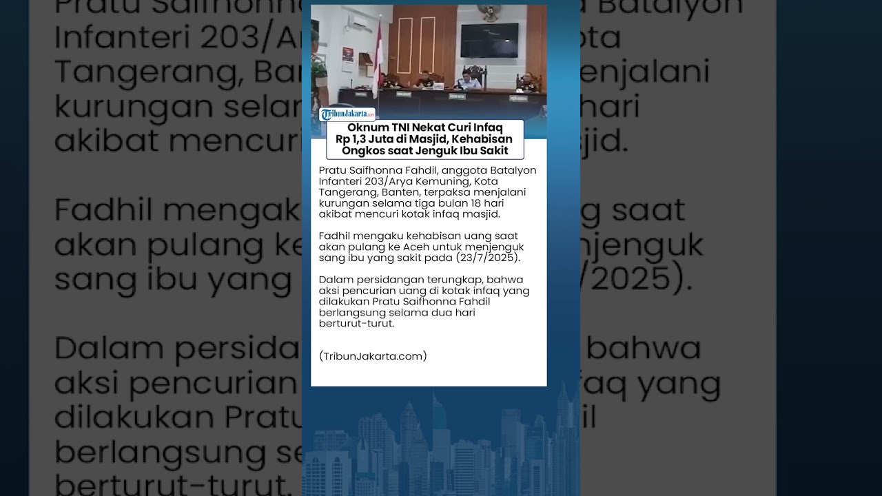 TRIBUN-VIDEO.COM - Pratu Saifhonna Fahdil, anggota Batalyon Infanteri 203/Arya Kemuning, Kota Tangerang, Banten, terpaksa menjalani kurungan selama tiga bulan 18 hari akibat mencuri kotak infaq masjid.